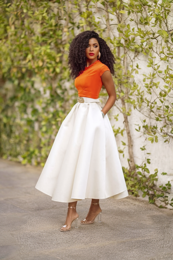 For a summer statement outfit, this white maxi skirt paired with a bright orange top is refreshing and eye-catching. The structured gold belt, clear heels, and bold accessories elevate this look, making it ideal for special occasions and stylish daytime events.