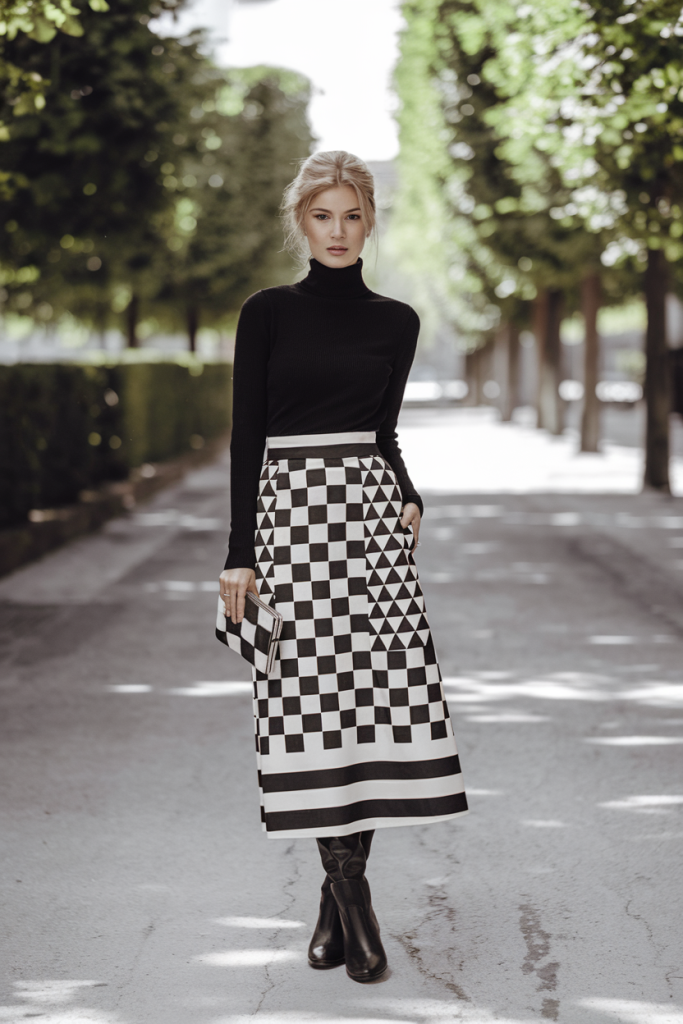 A black-and-white geometric midi skirt paired with a sleek black turtleneck is a perfect mix of sophistication and modern edge. The checkerboard and triangle print gives this outfit a bold, contemporary appeal. Styled with black leather knee-high boots and a matching clutch, this ensemble is perfect for winter and autumn outings, balancing classic and avant-garde aesthetics.