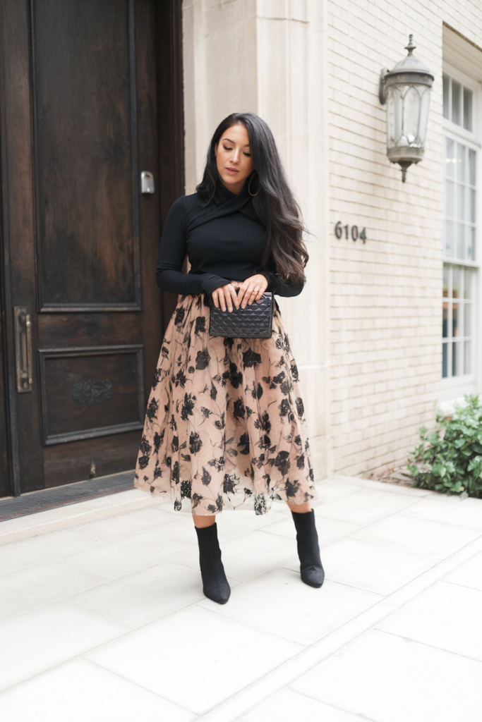 This beige tulle skirt with black floral embroidery is a romantic and ethereal piece that adds femininity to any autumn or winter wardrobe. Paired with a black fitted turtleneck and ankle boots, the look is both modern and classic. The quilted black clutch adds a touch of luxury, making this outfit ideal for evening events and semi-formal gatherings.