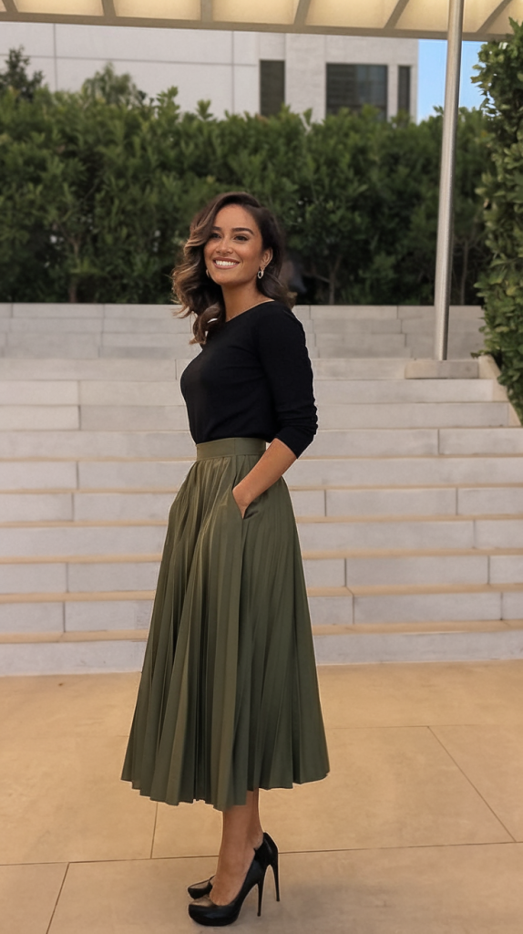 A pleated olive green midi skirt paired with a fitted black top brings a refined balance between minimalism and structure. Styled with black heels, delicate earrings, and soft waves, this ensemble is ideal for formal dinners, date nights, or upscale casual settings. The rich green hue makes it versatile across all seasons, offering a polished aesthetic.