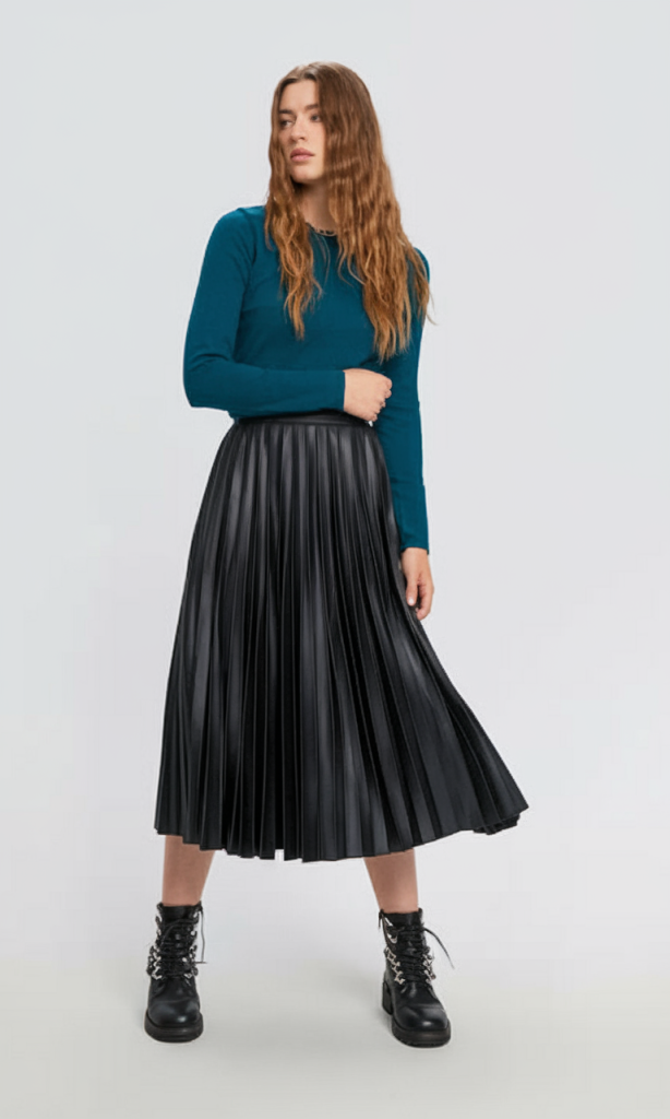 A pleated black leather midi skirt paired with a deep teal fitted sweater creates an edgy yet wearable look. The lace-up combat boots add a rebellious twist, making this outfit perfect for winter and autumn street style. Ideal for those who love blending bold textures with classic silhouettes, this look can be accessorized with statement earrings and structured handbags.