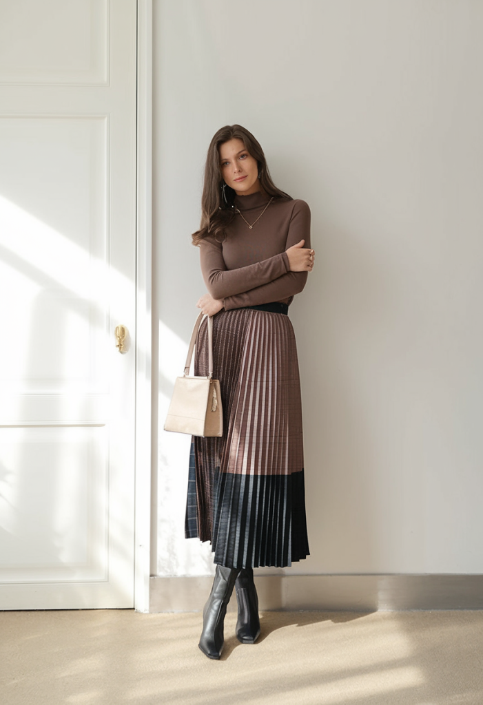 For an effortlessly chic autumn or winter outfit, a long pleated skirt in brown and black gradient tones is a standout choice. The fitted brown turtleneck balances the flow of the skirt, while black knee-high boots give it a sophisticated edge.