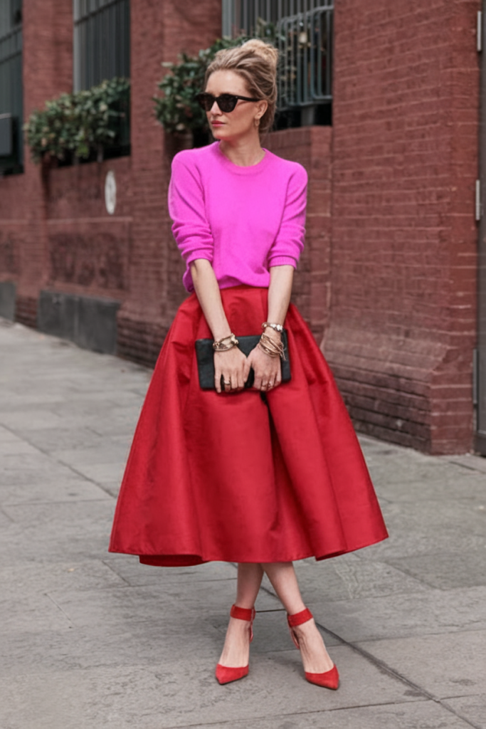 Bright and bold colors are taking over 2025. A voluminous red midi skirt paired with a vibrant pink sweater exudes confidence and creativity.