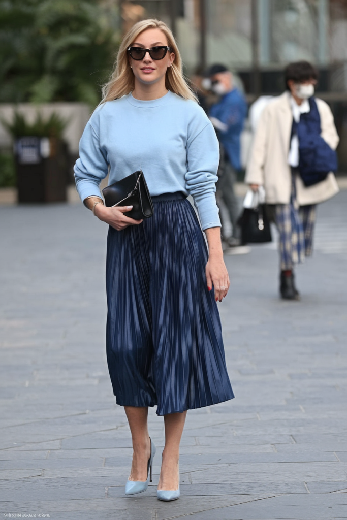 For a relaxed yet polished spring or fall outfit, a pleated navy midi skirt styled with a light blue cropped sweater creates a harmonious, monochromatic ensemble.