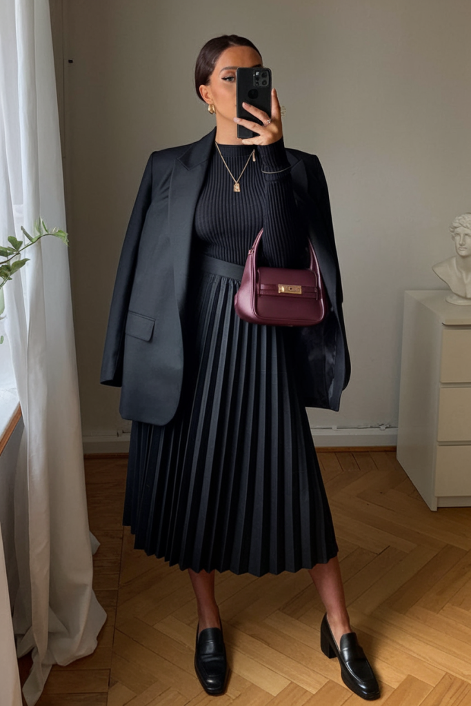 Nothing speaks of power dressing quite like an all-black ensemble. A black pleated midi skirt, a ribbed turtleneck, and an oversized blazer create a structured and modern look. This outfit works for autumn and winter, perfect for work or elegant evenings. Complete the style with black leather loafers and a burgundy handbag for a subtle pop of color.