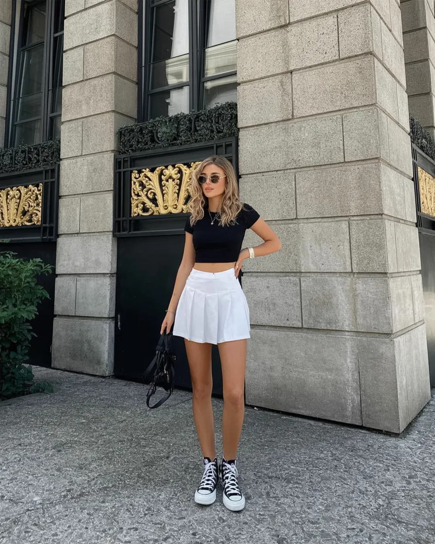 If you love pieces that can move through your real life, this is one of the smartest 2026 combinations to try. A Pleated or Tennis-inspired White mini is ideal for warm days because it feels airy and easy, and pairing it with a close-fitting black tee creates shape through the waist without needing extra styling tricks. It’s great for petites, athletic builds, or anyone who likes a leg-lengthening silhouette. Keep the accessories minimal, throw on sunglasses, and let the contrast do the work. This is the kind of casual look you can repeat all season and still feel fresh every single time.