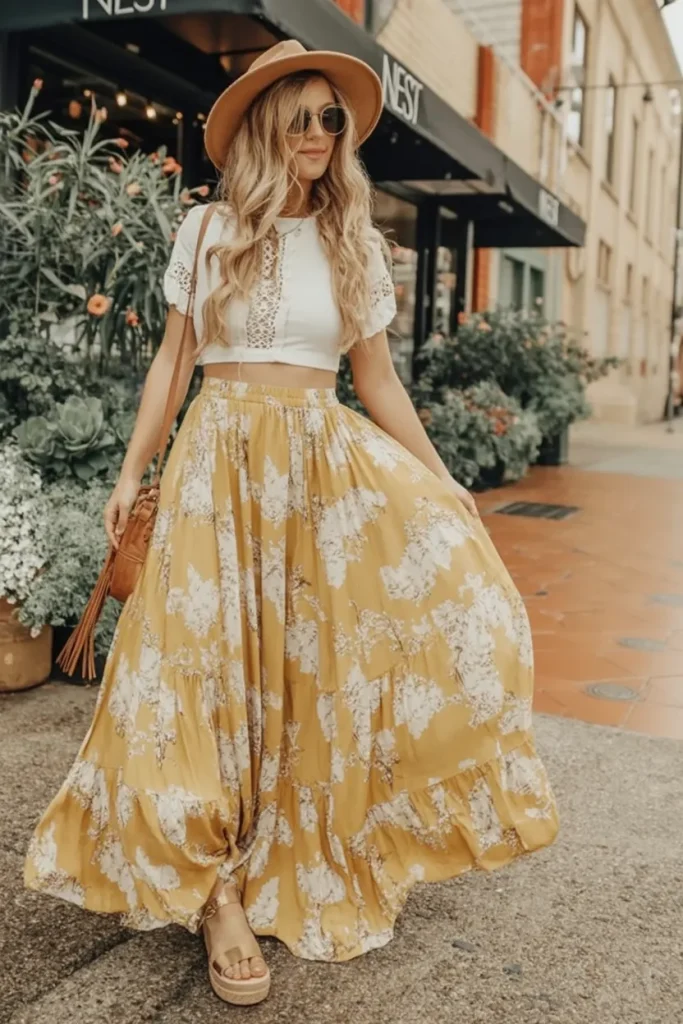 1. Golden Floral Maxi Skirt with a Breezy White Crop Top