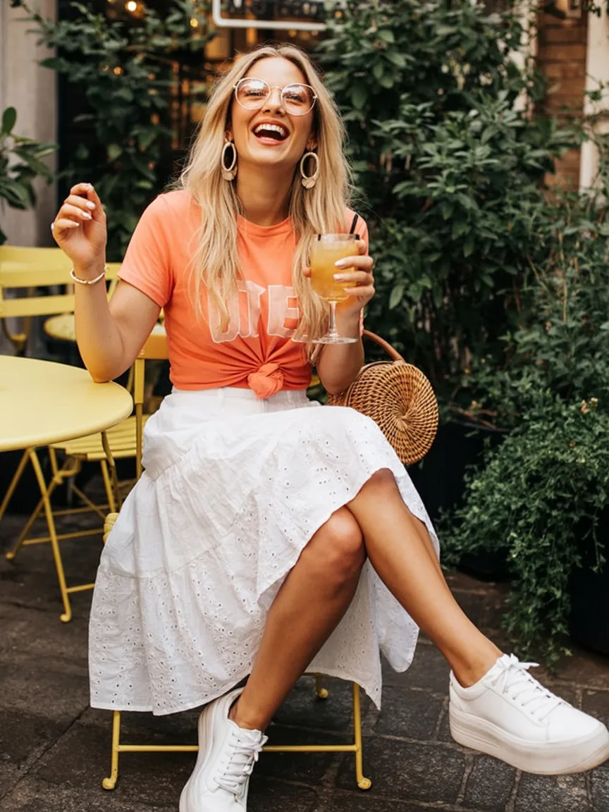 If you’re someone who loves outfits that feel effortless but still memorable, this is such a good one to keep in rotation. A White Midi or soft eyelet skirt adds texture without heaviness, and tying a simple tee at the waist gives shape in the easiest possible way. It’s especially flattering if you want a breezy silhouette that doesn’t cling through the hips. White sneakers keep it casual and comfortable for real life, while statement earrings or a woven bag give it extra personality. This is the low-maintenance kind of summer style that still makes you look like you really thought it through.
