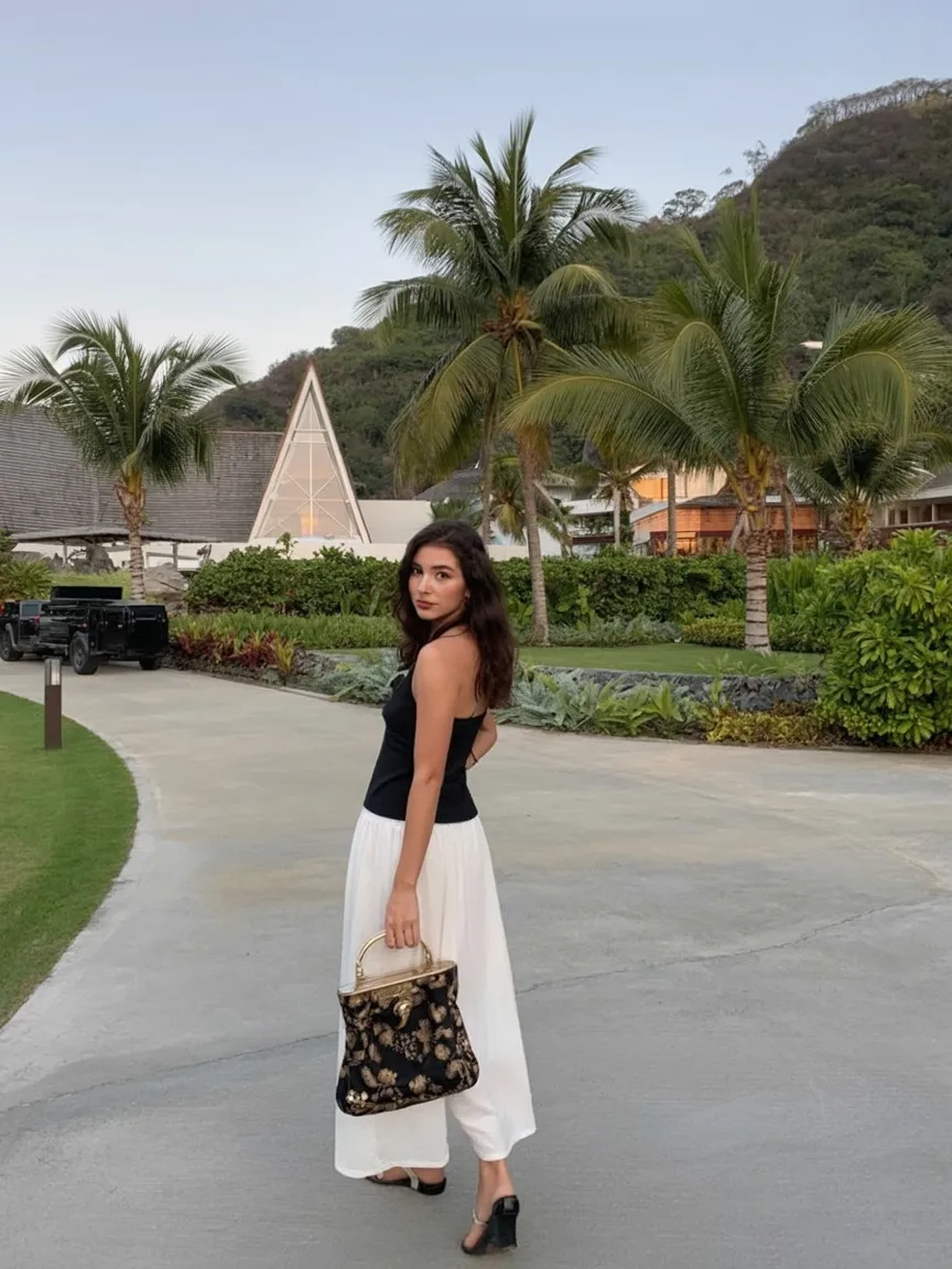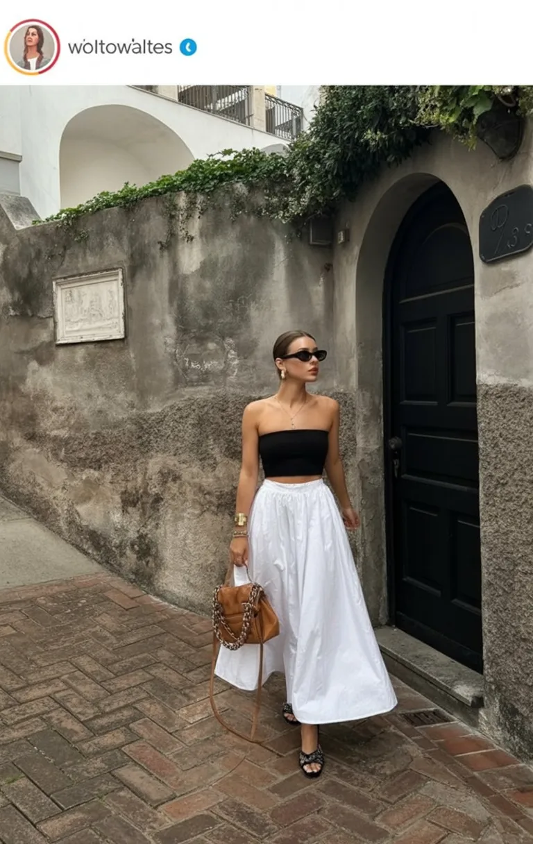 This outfit is proof that summer style can be minimal and still feel incredibly striking. The crisp White maxi skirt brings volume and grace, while the simple black bandeau creates that strong, clean contrast that always looks elegant. It feels grown-up, confident, and quietly glamorous without needing layers of accessories or complicated styling. There’s a slightly European mood to it—effortless, refined, and just a little dramatic in the best way. Honestly, it’s the kind of outfit that makes even a simple walk feel like a fashion moment.