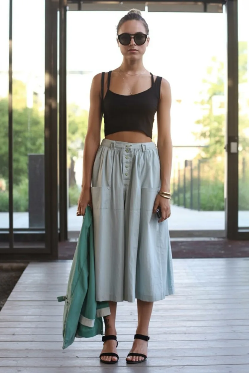 21. Soft Blue Midi Skirt with a Black Cropped Tank