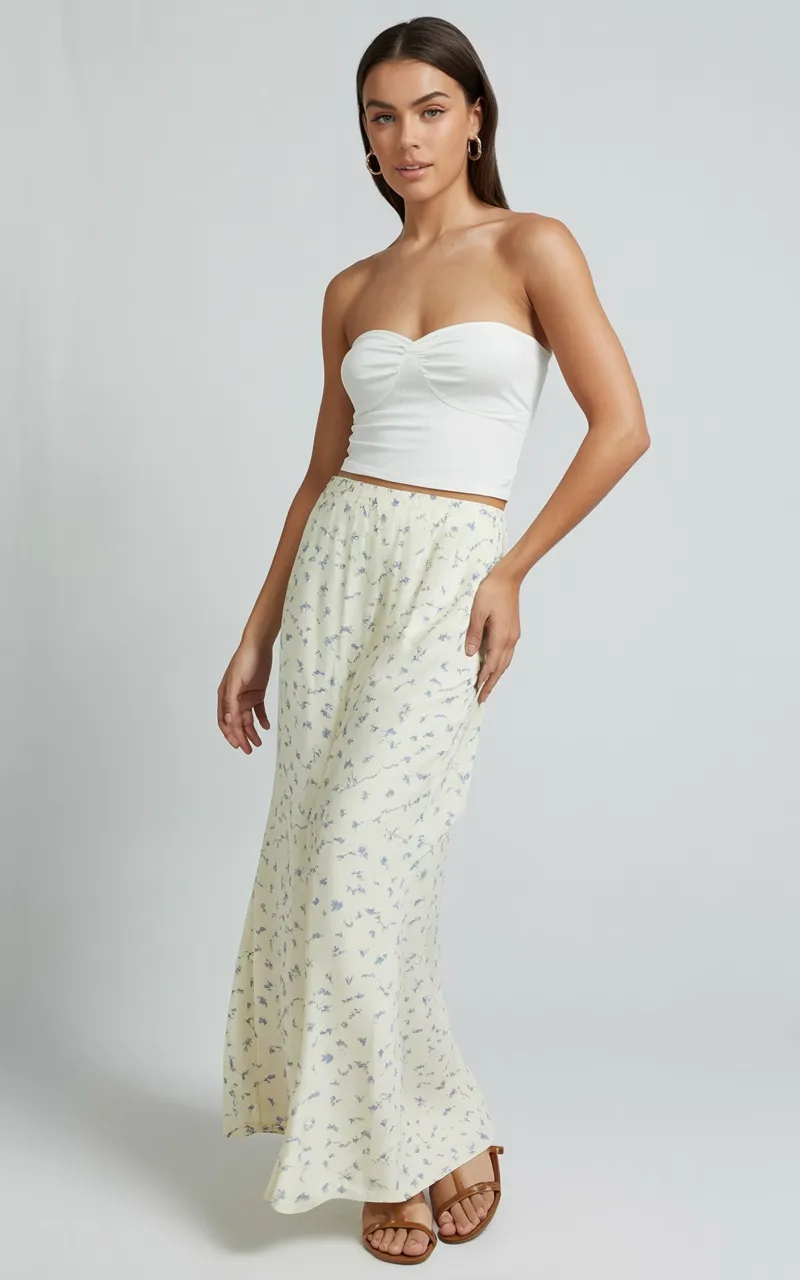 9. Soft Floral Maxi Skirt with a White Strapless Top