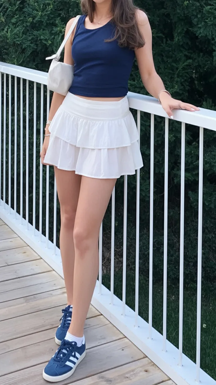 This outfit is pure easy summer energy. The soft, tiered White mini skirt brings movement and a little sweetness, while the navy cropped tank keeps things sporty and balanced. It’s the kind of look you throw on for a boardwalk walk, a coffee run, or a casual afternoon when you still want to feel cute. Nothing about it feels overthought, and that’s part of the appeal. It’s light, breezy, and just playful enough to make you feel younger without ever crossing into teenager territory. Honestly, it’s one of those outfits you’d reach for on repeat.