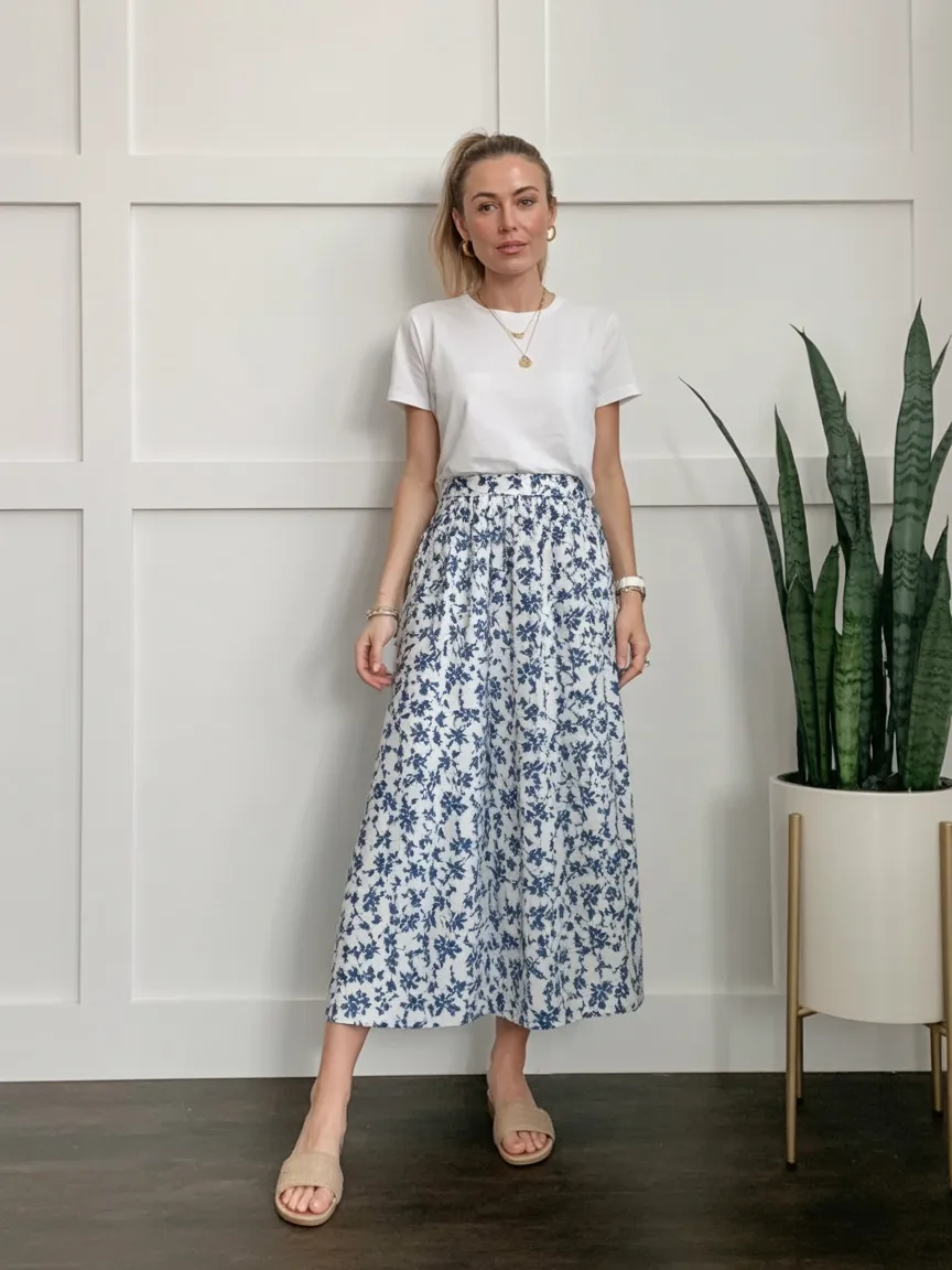 This is a perfect example of a look that earns its place in your closet because it asks so little of you. A soft Midi skirt with a light print is wonderfully forgiving in heat, and a plain white tee keeps the whole thing grounded and versatile. It suits everything from errands to lunch dates to casual work settings, depending on your shoes and jewelry. Flat slides make it relaxed, while a tucked tee and gold accessories push it into classy territory. Compared with a mini, a Midi length offers more coverage and a calmer silhouette, which is exactly why so many women come back to it every summer.