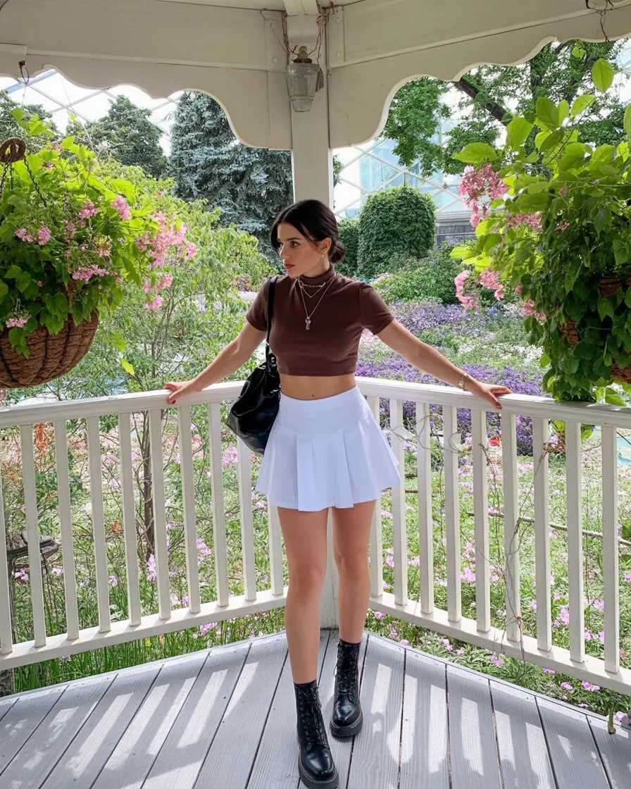 This outfit is playful, sharp, and just unexpected enough to be memorable. The White mini skirt has that classic sporty swing, but the fitted Brown top changes the mood completely, giving the outfit a richer, more fashion-forward feel. Add black boots, and suddenly it’s not just cute—it has personality. There’s a slightly rebellious energy to the mix of soft and strong pieces, which makes it such a fun summer combination when you’re tired of the same old tank-and-sandals routine.