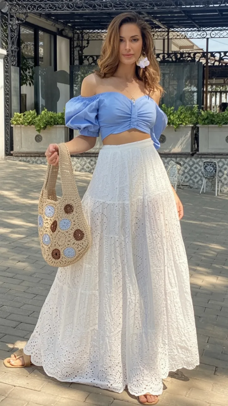 This outfit feels like a deep breath on a hot day. The airy White maxi skirt brings softness and movement, while the blue top adds just enough shape and romance to keep the whole look from floating away. It has that dreamy, feminine balance so many summer outfits try for but don’t quite reach. Here, it works. The proportions are flattering, the mood is light, and there’s a slightly Mediterranean feel to it that makes you think of slow afternoons, pretty cafes, and dressing up simply because it feels good.