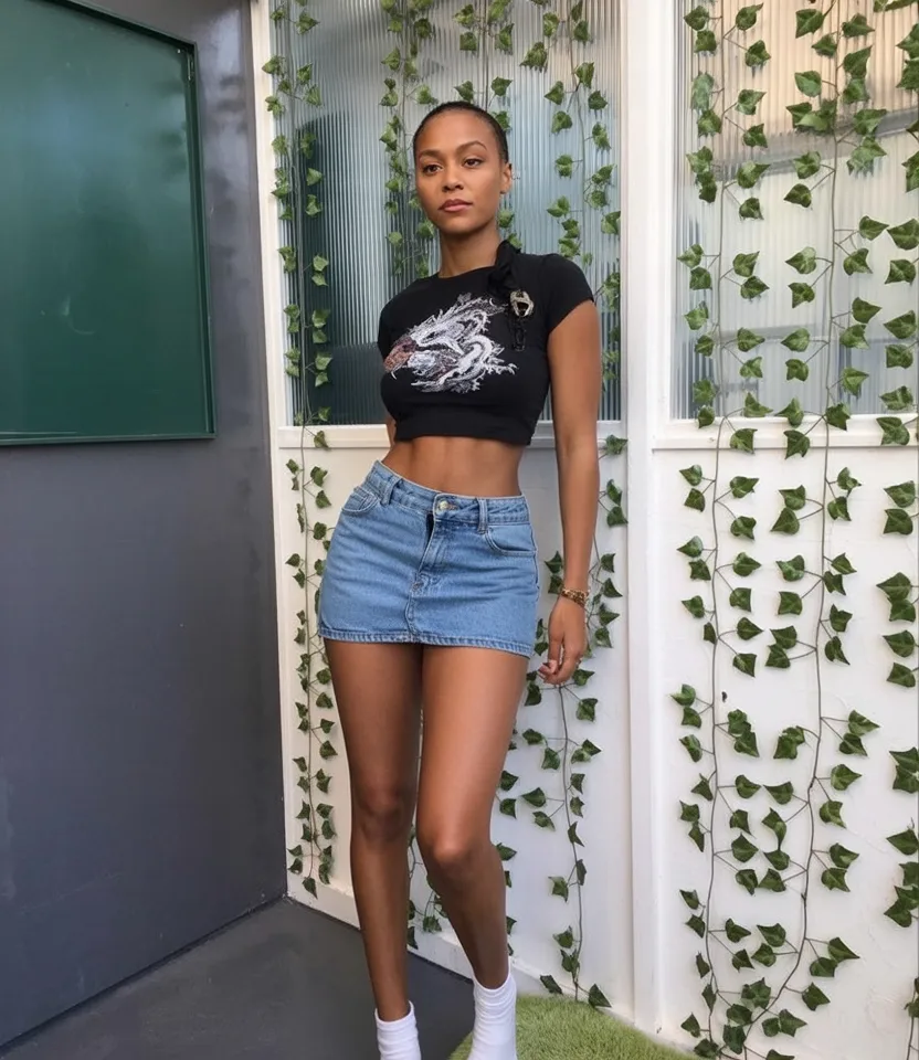 This look is all about confidence with a clean, unfussy finish. The Denim mini skirt keeps things classic and summery, while the black cropped tee adds a cooler, sharper edge that makes the whole outfit feel current. It’s streamlined, simple, and a little sporty, but still very stylish. There’s no extra fluff here, which is exactly the point. It has that easy “I know what works on me” energy that makes even a very basic outfit feel strong and pulled together.