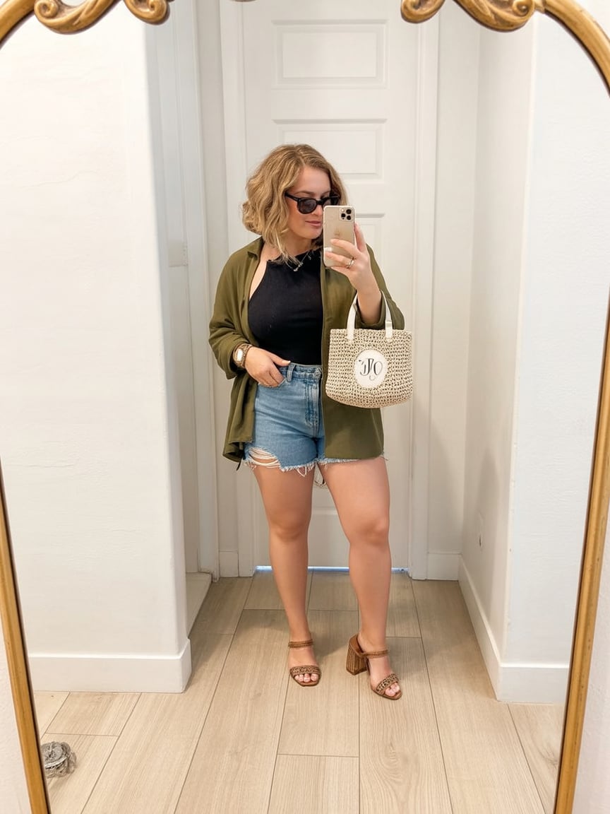 You realize that “I didn’t try…but I absolutely nailed it” energy? This is it. The laid-back olive layer adds a touch of downtown cool, and denim shorts keep it youthful and fun—as if you were the friend who always discovers the coolest drinking spot and somehow scores the best table. It’s casual but not too much so; there is structure so as to feel somewhat intentional.