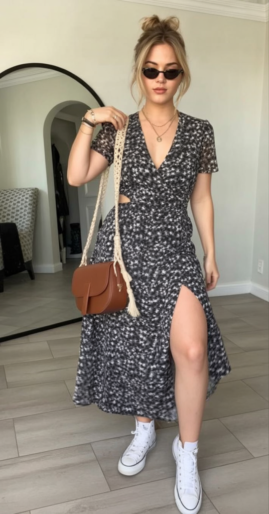 18. Black Floral Wrap Dress with Sneakers for Modern Brunch