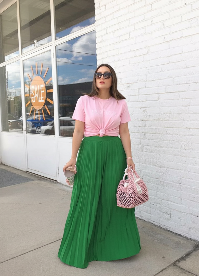 Pink and green together always feels cheerful—like flowers, like fresh markets, like the first warm weekend that makes everyone suddenly nicer. This outfit is bright without being loud, and the pleated skirt adds that swish that makes you feel pretty even when you’re just standing in line for coffee. It’s fun, modern, and very brunch-approved.