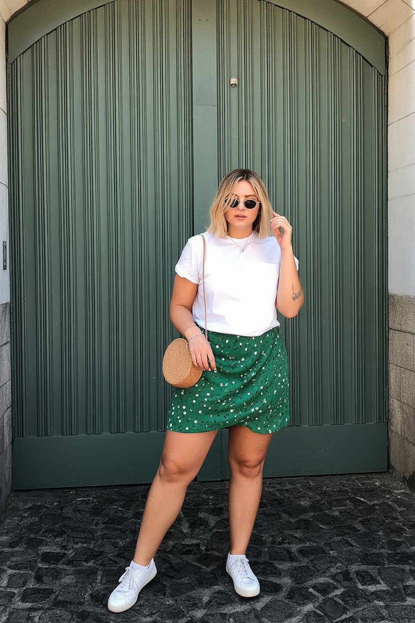 2. White Tee and Green Mini Skirt for Easy Sunday Brunch