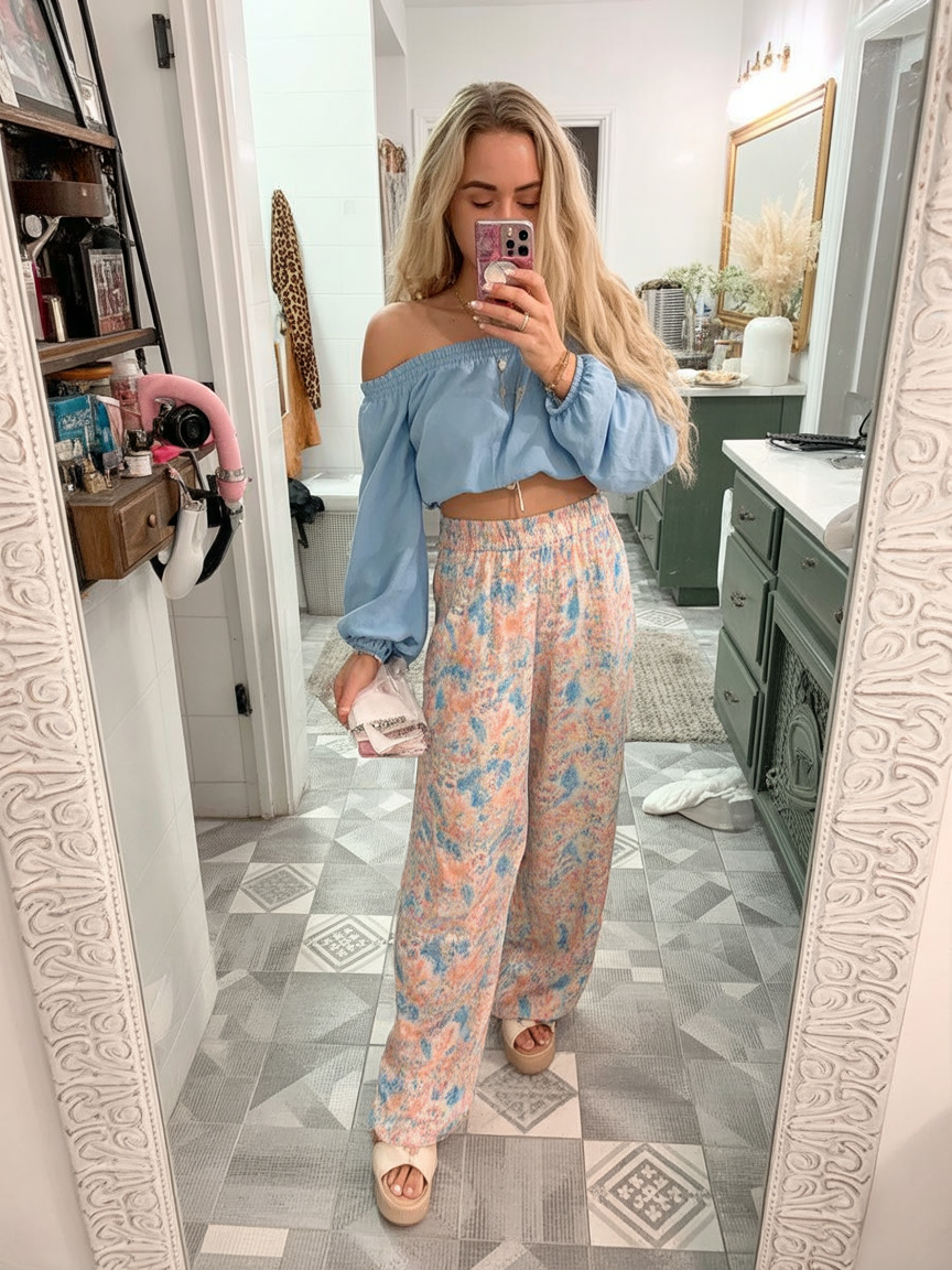 12. Off-Shoulder Blue Top and Pastel Wide-Leg Pants