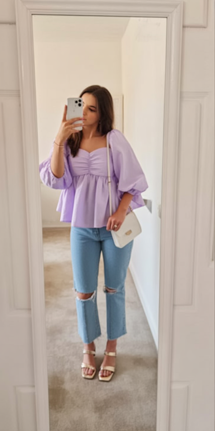 4. Lavender Statement Top with Light Denim for Pretty Brunch Energy
