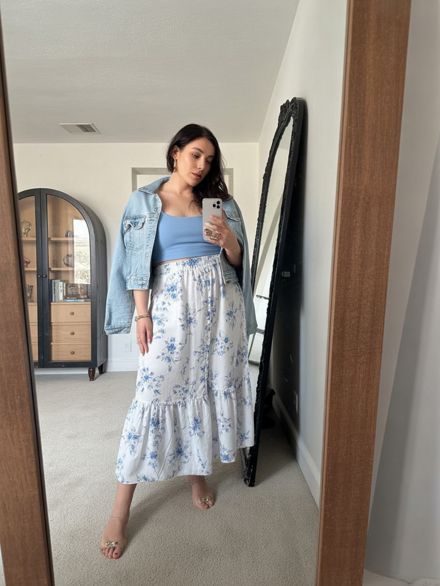 This outfit is like a hug from your closet—feminine and comfortable with just enough structure to make you feel put together. The floral skirt provides that soft spring romance, while the denim jacket gives you “I’ve got this in case the weather gets unruly” confidence. It’s the sort of feel you grab when you want to be pretty but also practical.