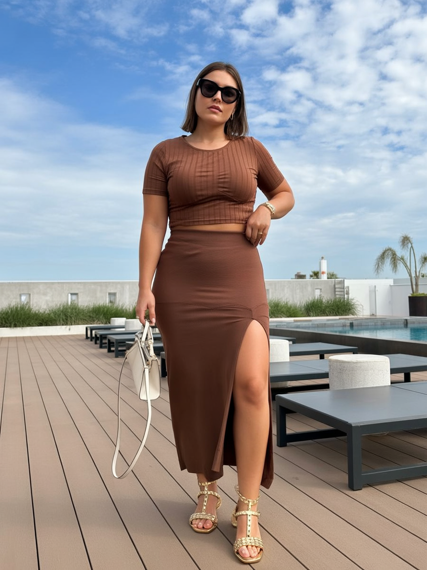 This is one of those outfits that makes you sit up straighter the moment you slip it on. The squeaky-clean white top, though, feels sporty and pulled together, and that rich brown skirt brings a grown woman energy—in the best way. It’s sleek, a smidge sexy on top, and still completely brunch-appropriate—when you want your fancy without trying too hard.