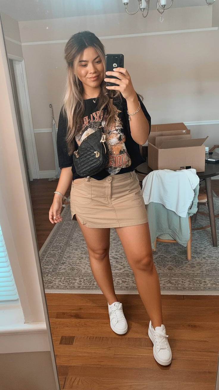 8. Band Tee and Tan Mini Skirt for Fun Brunch Plans