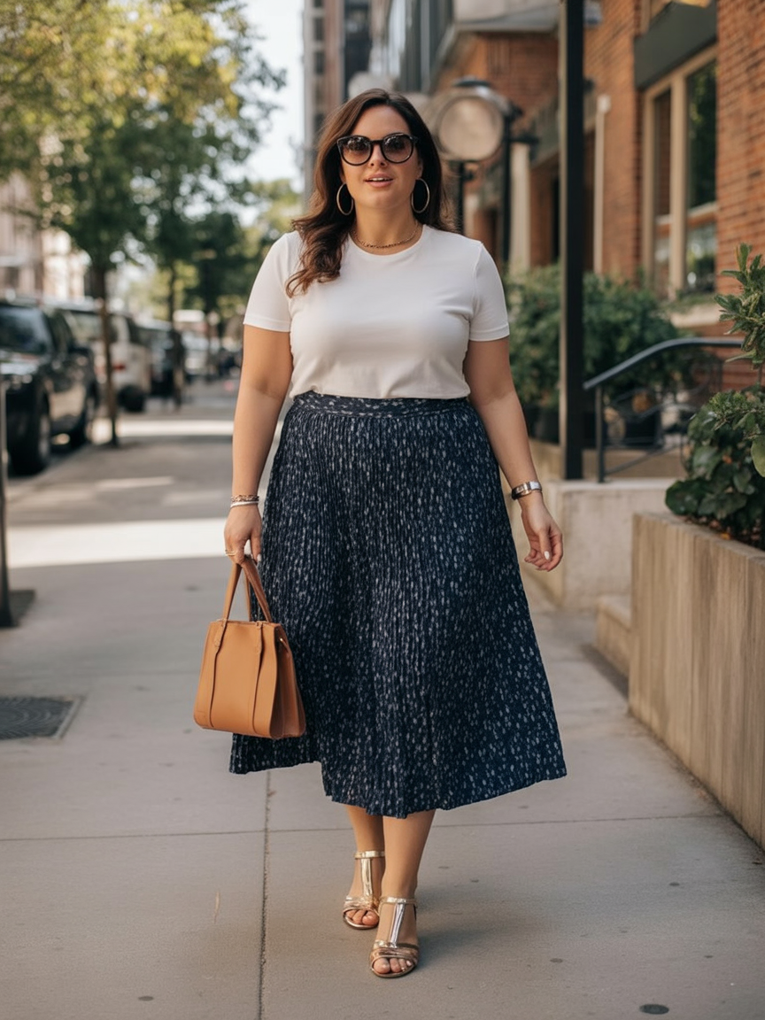 7. White Tee and Navy Midi Skirt for Classic City Brunch