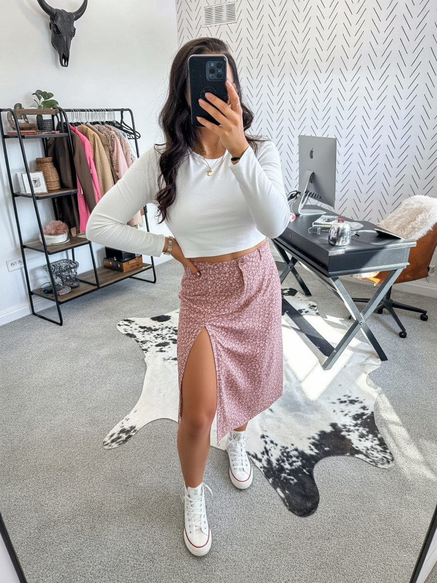 5. White Long-Sleeve Top and Pink Midi Skirt with Sneakers