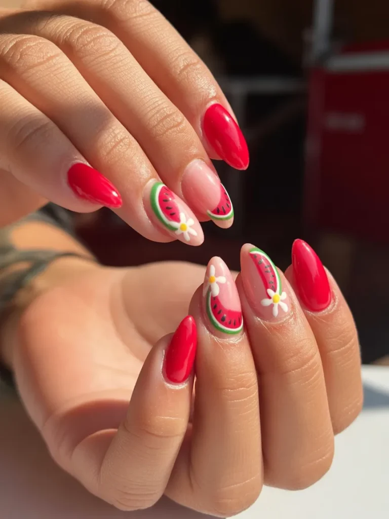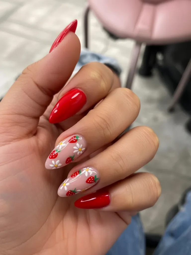 A bold red paired with soft nude fruit Art is always a winning combination. The contrast makes the strawberries and daisies stand out beautifully without overwhelming the look. It feels balanced—strong but still feminine. Honestly, it’s the kind of manicure that works just as well for date night as it does for everyday errands.