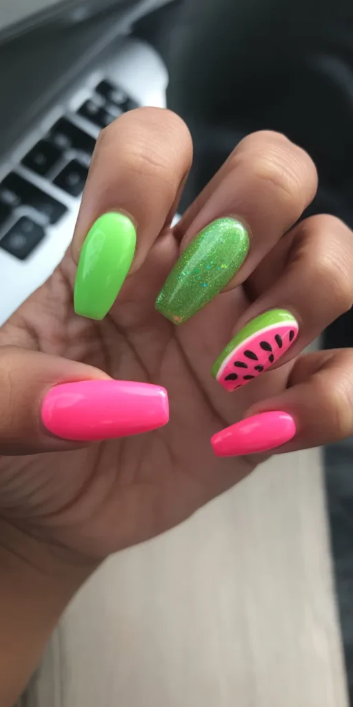This Design works beautifully on medium to long square or tapered shapes because the clean edges enhance the color contrast. It’s perfect for women who love statement nails and aren’t afraid of trendy shades. Keep the rest of your look simple—a white tee, denim, maybe a bold lip—and let these fun fruit ideas do all the talking.