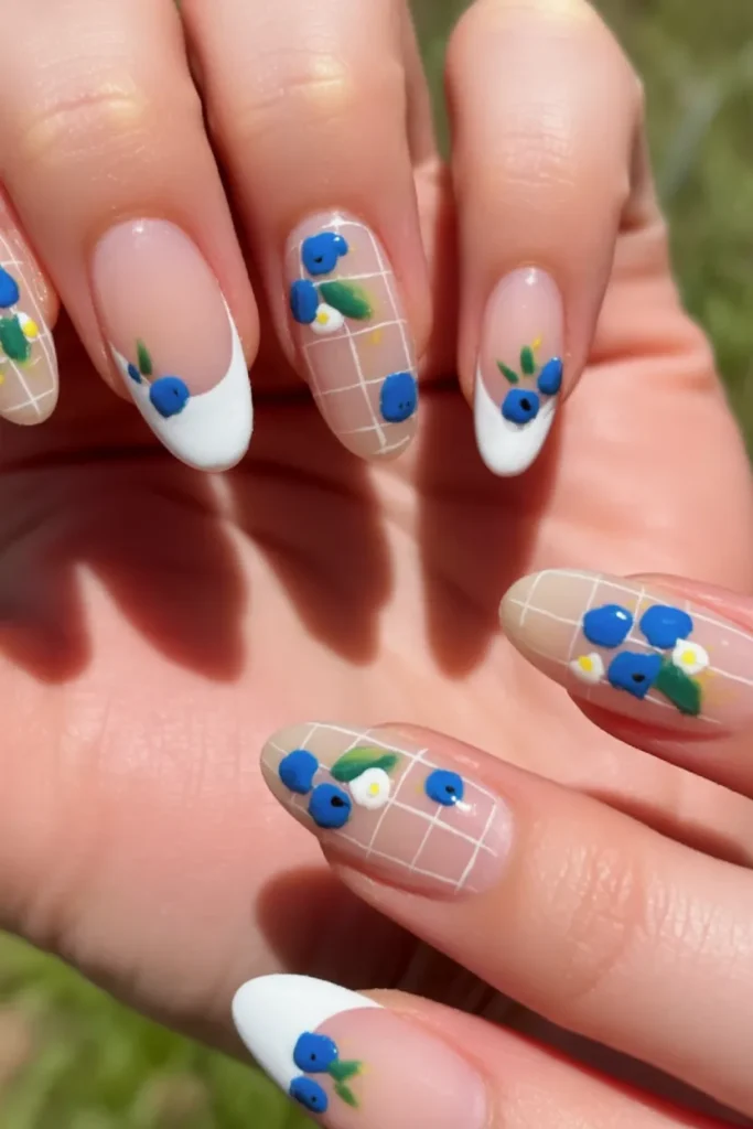 There’s something so charming about that soft grid pattern paired with tiny blueberries. It feels like a picnic blanket reimagined as nail Art — nostalgic, sweet, and unexpectedly stylish. The nude base keeps it grounded, while the blue fruit adds just enough contrast.