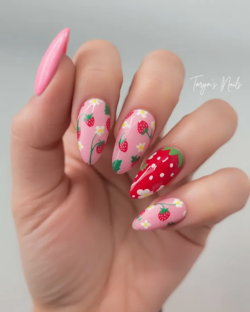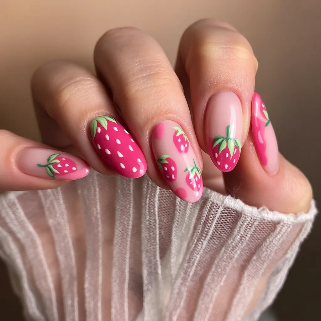 Almond shapes really elevate this Design and keep it from feeling too busy. Compared to a classic french tip, this look is much more expressive and perfect if you love statement Art. In 2026, strawberry ideas are everywhere, but this version keeps things clean with a soft base underneath. It’s trendy, eye-catching, and surprisingly versatile.