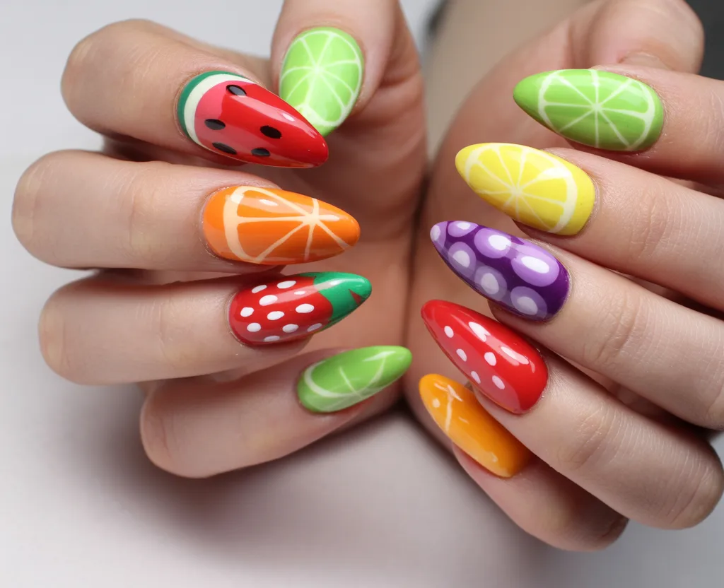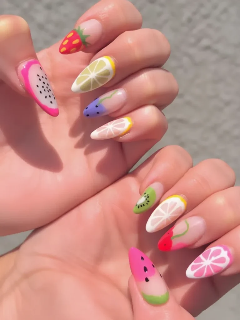 This Design is perfect for almond nails and for women who aren’t afraid of color. The trick is keeping each fruit detail clean and evenly spaced so it doesn’t overwhelm. In 2026, mixed fruit Art is having a big moment, especially when paired with soft base shades. These ideas feel bold but still wearable for everyday life.