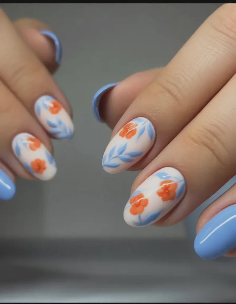 There’s something so calming about this soft blue and orange floral combination. It feels like a quiet walk through a spring garden when everything is just starting to bloom. The cool-toned base mixed with warm petals creates that effortless contrast we all love. It’s fresh, feminine, and just bold enough to feel special without being loud. This is the kind of nail Art that makes even jeans and sneakers look styled.