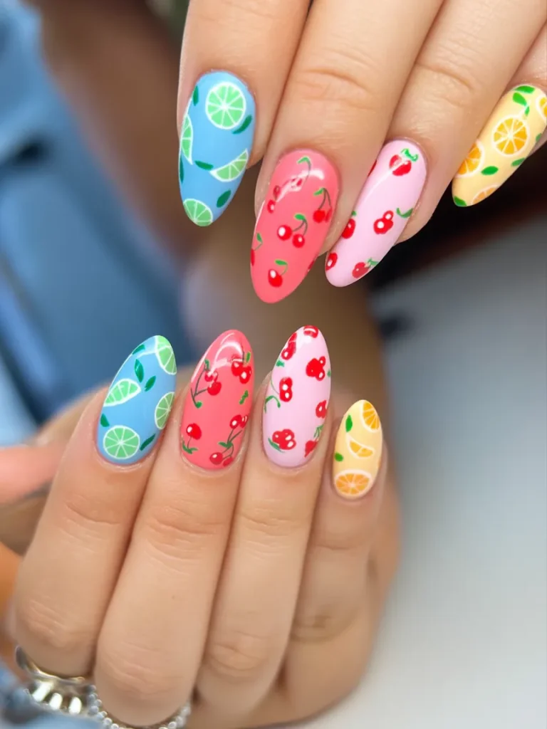 This manicure feels like walking through a sunny farmer’s market. Lemons, cherries, and bright citrus slices scattered across pastel backgrounds create such a happy, energetic vibe. It’s playful without feeling chaotic—every nail brings its own little story. Honestly, it’s the definition of fun spring Inspo.