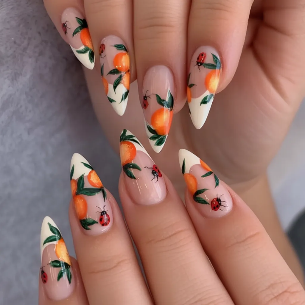 This is ideal if you prefer softer color palettes but still want playful fruit ideas. Almond or oval shapes keep it elegant. In 2026, delicate floral-and-fruit combinations like this are becoming a favorite for women who want subtle but trendy Designs.