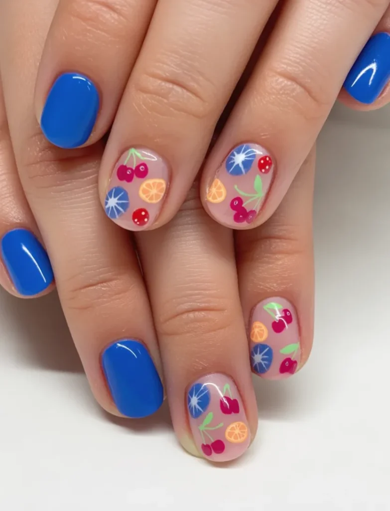 Short nails are practical for busy lifestyles, and this Design keeps maintenance simple. It’s ideal if you type all day or prefer low-fuss manicures but still want trendy 2026 ideas. The solid blue adds structure, while the fruit Art keeps things playful. It’s the perfect balance between polished and fun.