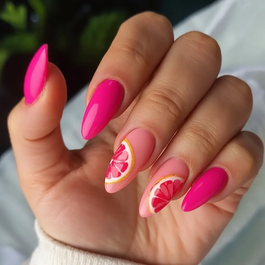 Hot pink paired with citrus slices is such a confident choice. It’s bold, feminine, and impossible to ignore. The glossy finish makes the color look rich and vibrant, while the fruit detail adds that playful twist. It’s glam with a touch of fun—and honestly, sometimes that’s exactly what we need.