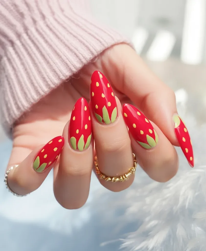 These bold red strawberry nails are pure confidence. The clean graphic style feels almost modern Art inspired — minimal detailing but maximum impact. There’s something empowering about committing to one strong theme and letting it shine across every finger. It’s playful, yes, but it also feels polished and intentional.