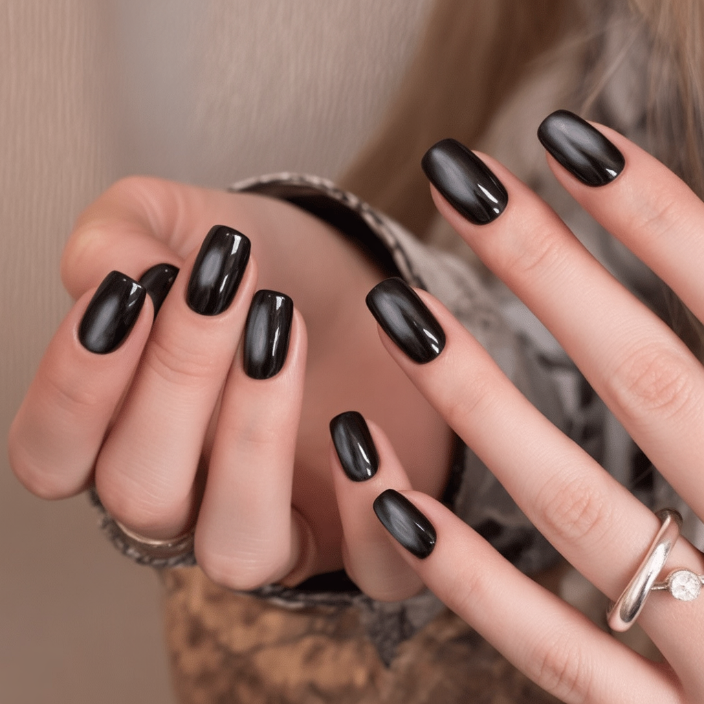 Black nails can be harsh-when applied with cat-eye shimmer, they instead turn highly sleek and seductive. These glossy black nails have a soft reflective stripe that imparts depth, somewhat like that of wet obsidian. Edgy, but oozing with sophistication.