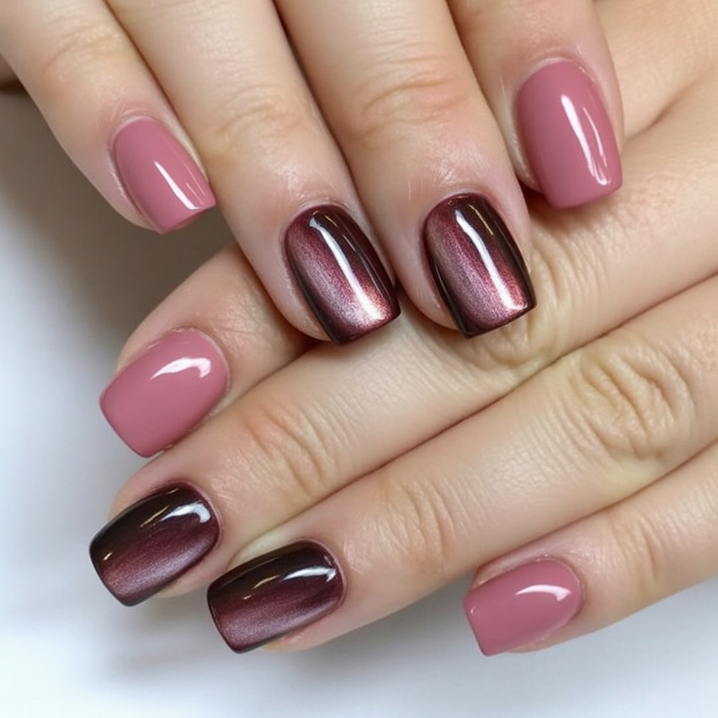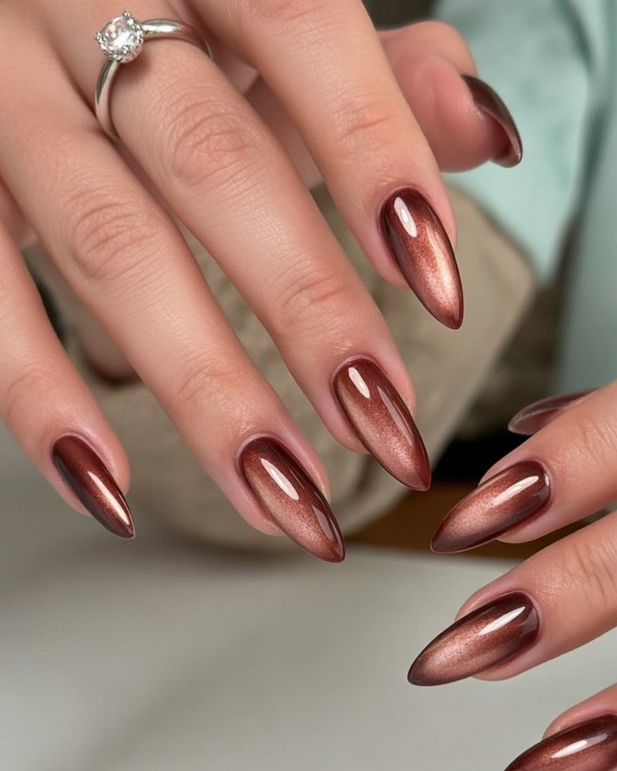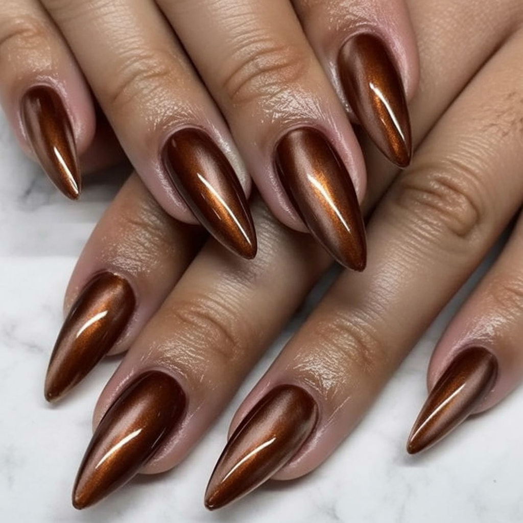Dark and glossy is the chocolate-toned cat eye manicure if you are into rich earthier shades. The reflection and shimmer gave it a kind of depth-it is more interesting than flat brown polish. It is warm yet chic, much like a cashmere sweater.