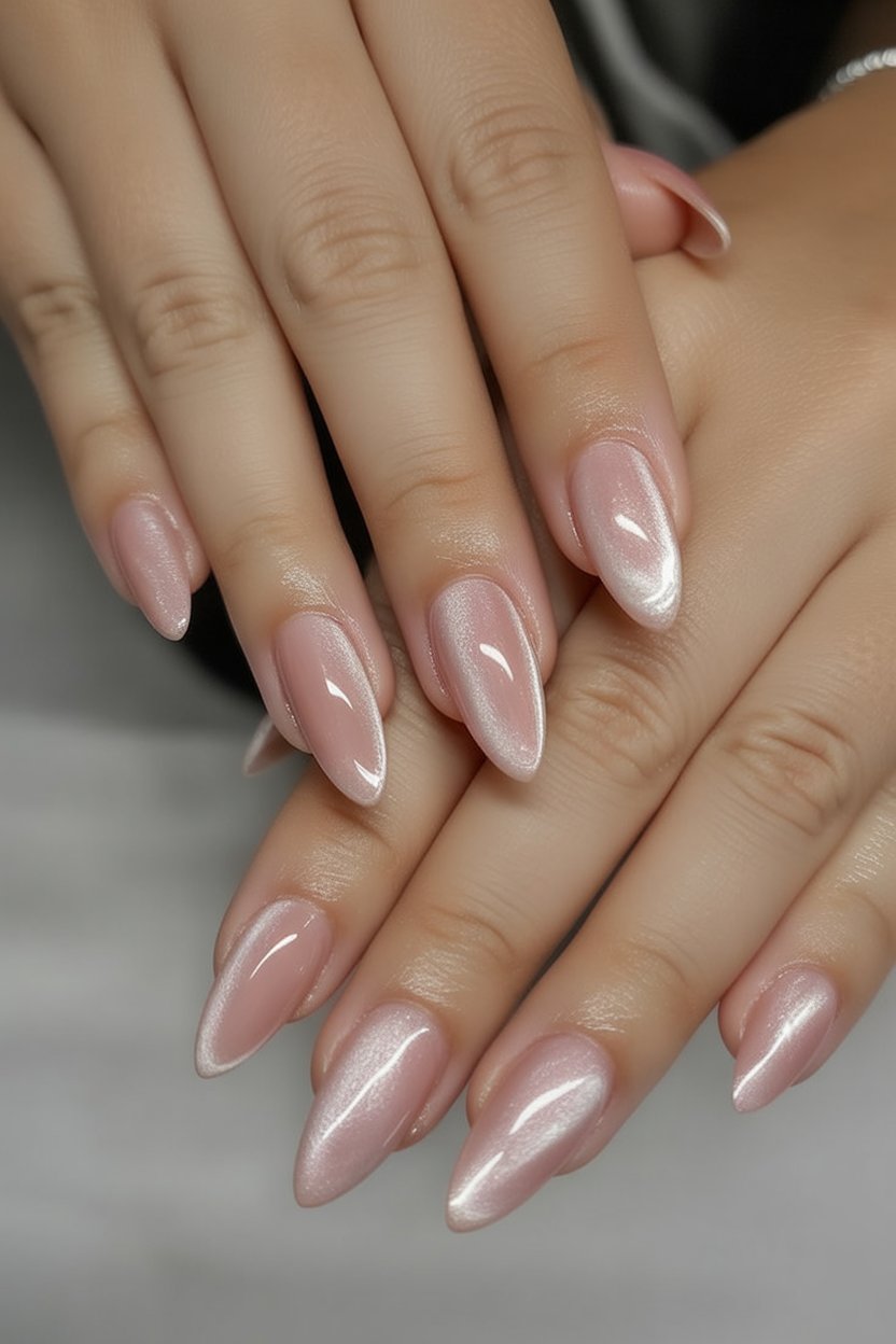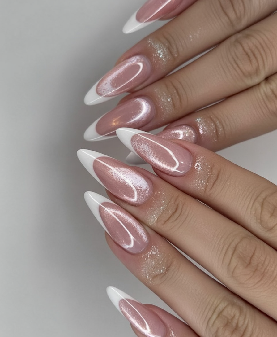 This design takes the classic french and turns it ethereal with a pearly cat eye glow. The soft pink base keeps it delicate, while the shimmering white tips add a dreamy highlight that moves like satin under light. It feels bridal, angelic, and still stylish enough for every day.