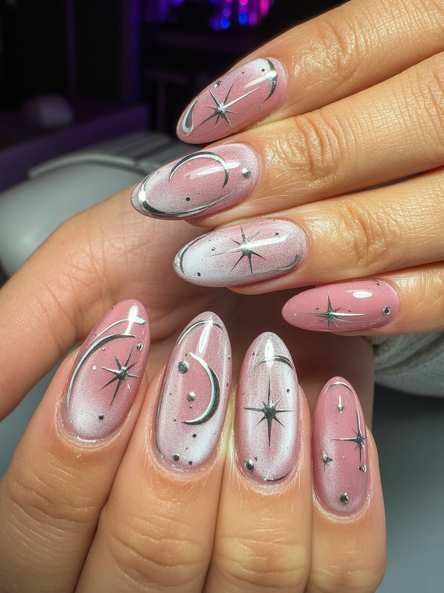 The manicure was designed by inspiration from the entire night sky. A shimmering pink base blends with silvery accents, taking star-and-moon art to a whole new level. It’s whimsical, celestial, and perfect for anyone who enjoys making a statement with their nail designs. Each nail feels like a tiny galaxy, enlivening every movement with sparkle.