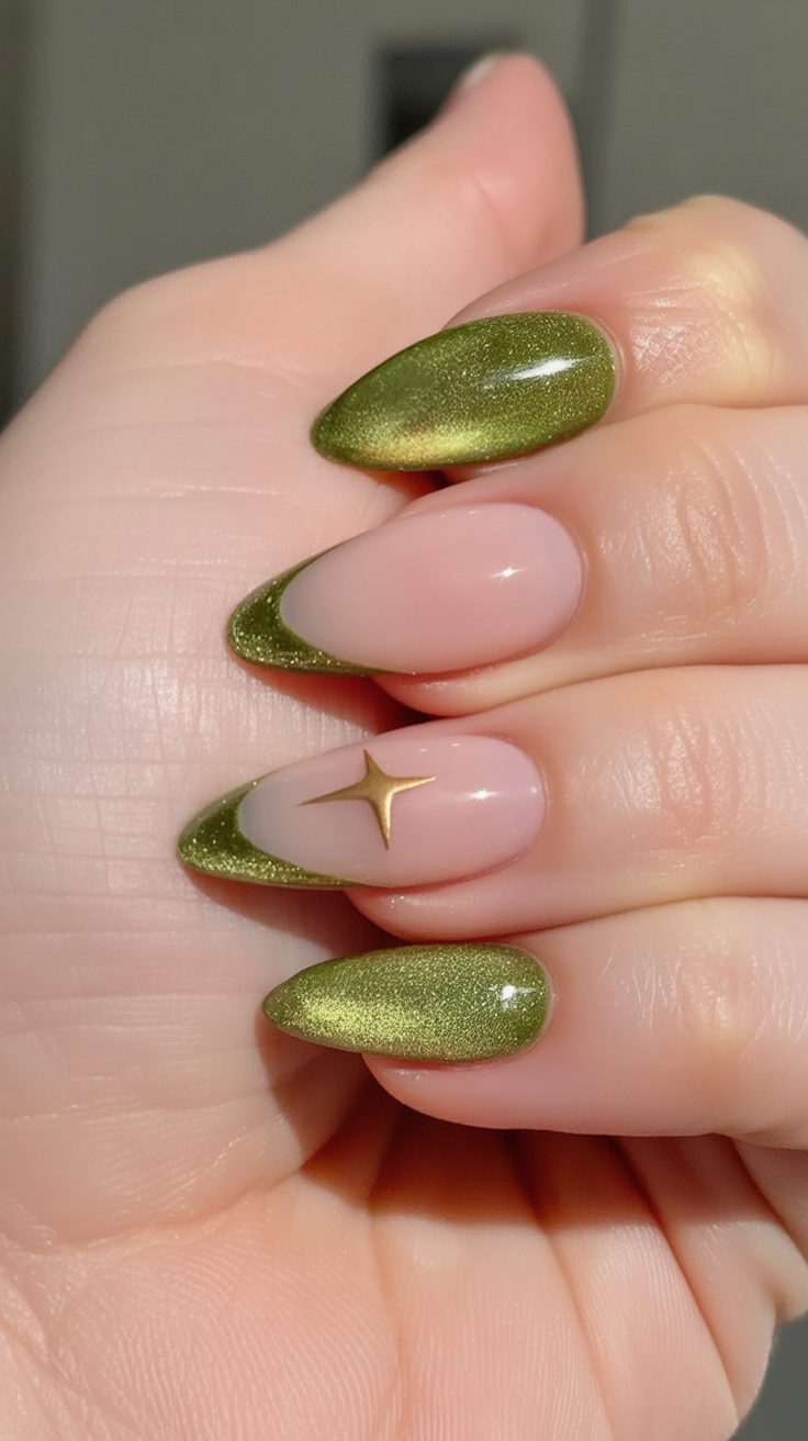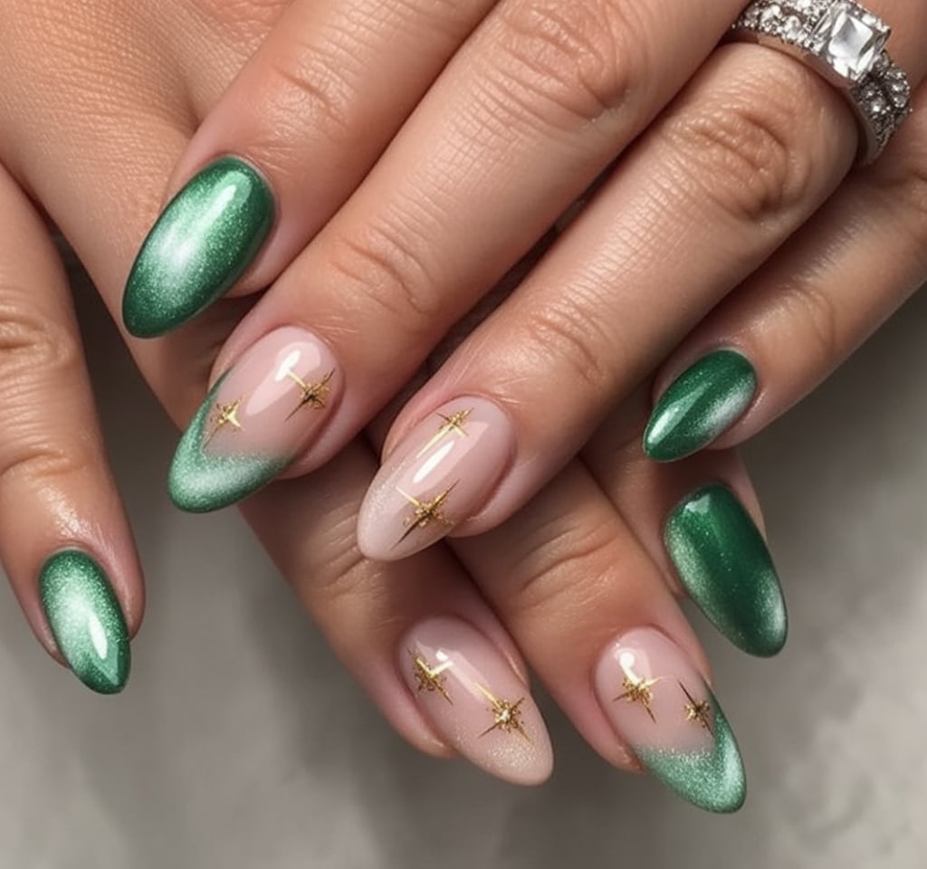 This manicure pairs emerald green cat eye polish with nude bases and little gold stars, forming a celestial french design, magical but wearable. It feels classy with a droll humor, like a glint of sparkle hiding under your sleeve.