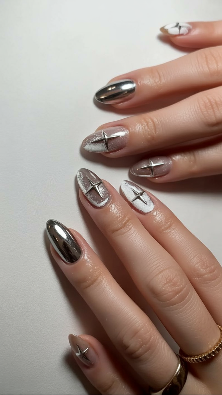 The design most perfect on medium or longer oval-shaped nails, giving enough space for the artwork in detail. The nail artist can drag the silver shimmer into that mesmerising cat-eye streak using a magnetic wand, then layer on black and white stars for definition. This might be the ultimate in playfulness and sophistication, especially if one is craving nails that act as accessories.
