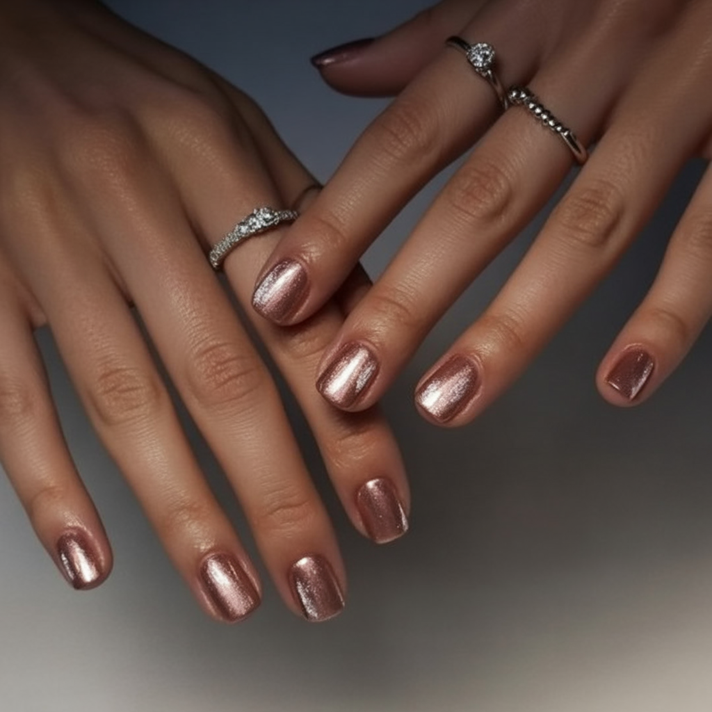 For those who are juggling work, errands, and a busy lifestyle, this is the rescue. Shorter squared or rounded nails are just easier to maintain; metallic shimmer means they forever look freshly polished. It goes well with silver jewelry and carries along a neutral wardrobe, just adding a punch of style that requires too little upkeep.