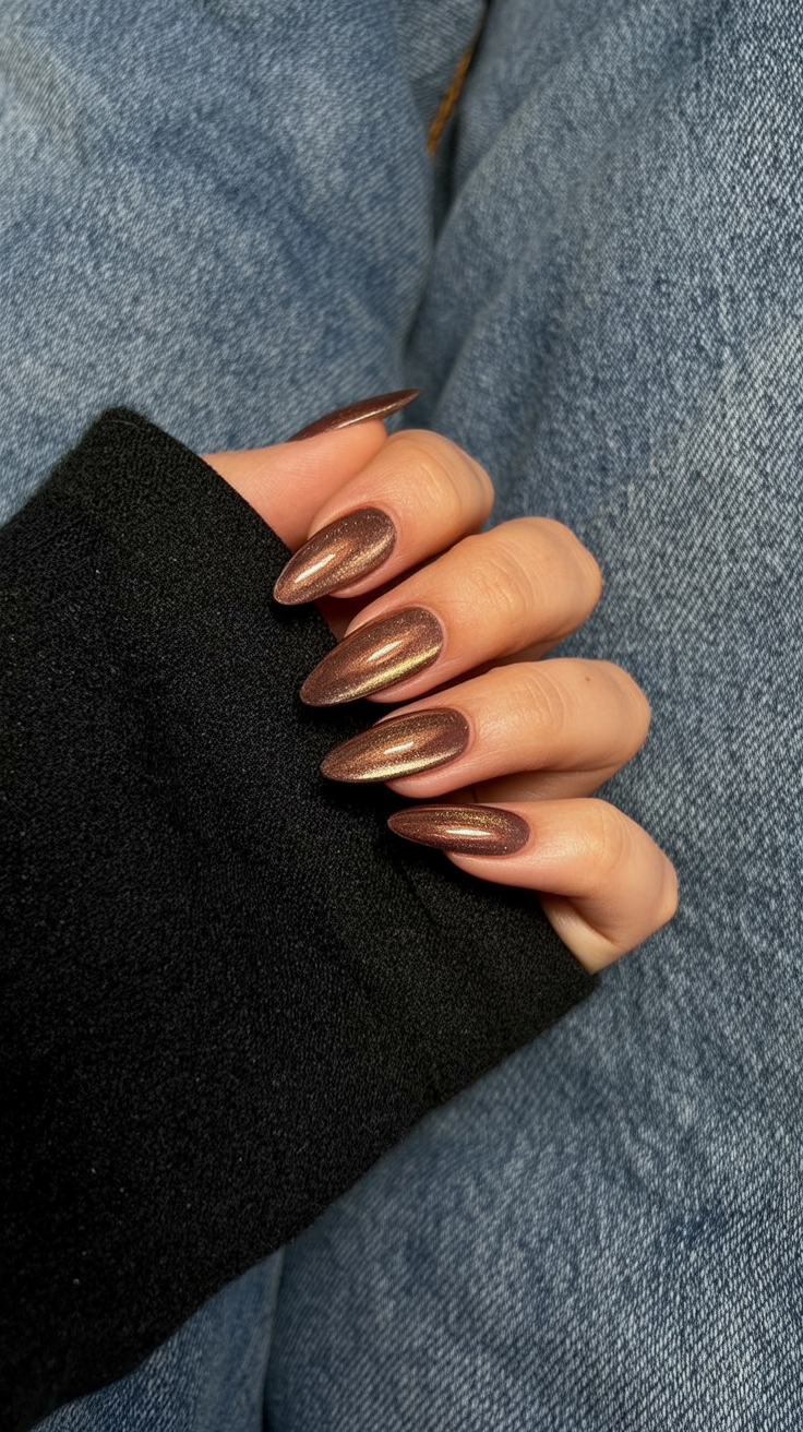 The coating gives a tint of bronze cat-eye glow paired up with an oversized sweater sleeve and denims- ugghhh…comfort is just irresistible! It’s that in-between state of fall-warm coffee, golden-hour daylight, and just a tiny bit of sparkle. The polish shimmers from brown to gold, very subtly, giving nails that ember-like glow that is both laid-back and classy.